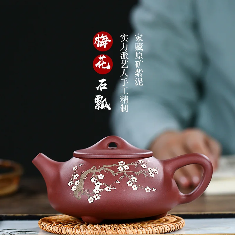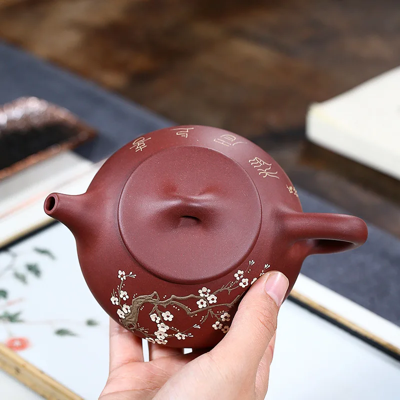Place Of Origin Yixing Manual Plum Blossom Stone Drum Dark-red Enameled Pottery Teapot Raw Ore Brig