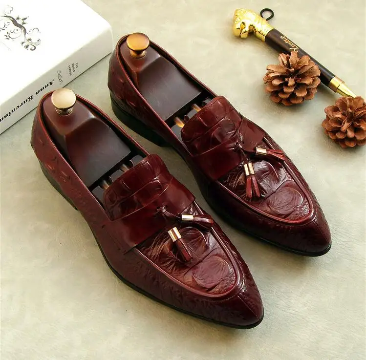 Best Shoes Men Smrt Casual Flats Genuine Leather Stone Pattern Tassels Pointed Toes Slip On Loafers Wedd